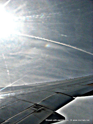 Евгения Сазонова 3 сентября 2008 на самолёте при подлёте к Москве увидела из иллюминатора гало, сделала несколько фотографий, разместила их на астрофоруме. я немного обработал их фильтром «контурная резкость» и попробывал склеить в панораму (1). Наблюдались паргелии, малое гало, опоясывающее гало, паргелический круг. наблюдение на 7-8 баллов.