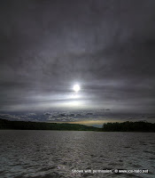 Четыре фотографии гало. Невооружённым глазом оно было плохо видно, но хорошо наблюдалось в очках с поляризационным покрытием. Так как у меня не было полярика на объектив, то потом при обработке пришлось сдлеать превеликие пляски с бубном, чтобы хоть как-то гало вытащить. Наблюдалось 17 июля 2008 года на Ладоге, над о. Сависалонсари. Собственно, на последней фотографии вы его увидите с огромным трудом — но примерно так оно в реальности выглядело.