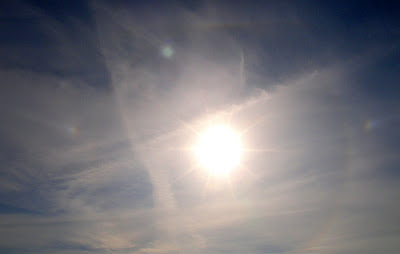Решил сразу же поместить пару фотографий последнего явления гало. 24. 11. с утра возле Солнца появился слабый паргелий, который вскоре исчез. А в 11 часов образовалось малое гало, которое продержалось около часа. Время от времени можно было заметить верхнюю треть очень слабого большого круга гало. На фотографии его достаточно легко заметить.