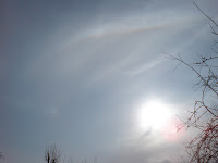 (малое гало и паргелии)Настоящее солнце было в центре спектрального круга (малого гало), два фантомных сопровождали его слева (паргелии) и справа и лежали на противоположных точках мысленно проведённого диаметра. Облачность рассеялась, и радужный круг засиял особенно ярко на чистом голубом небе.